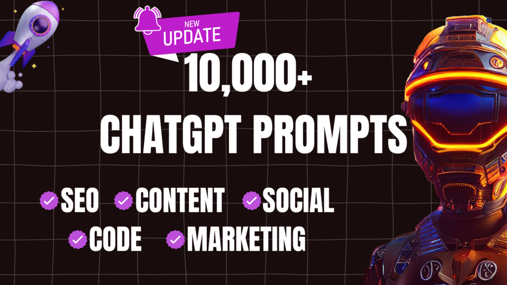 You will get 10,000+ ChatGPT Prompts for Marketing, SEO, Content, Social, Code that gets updated Weekly!